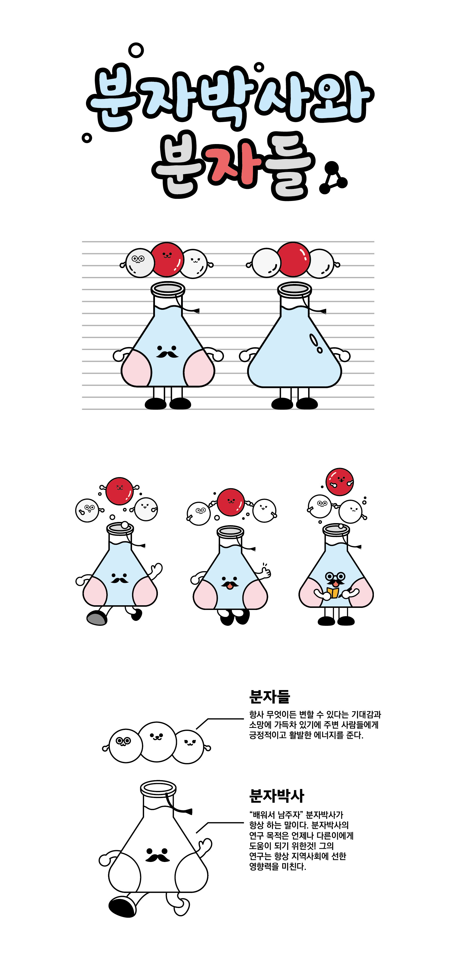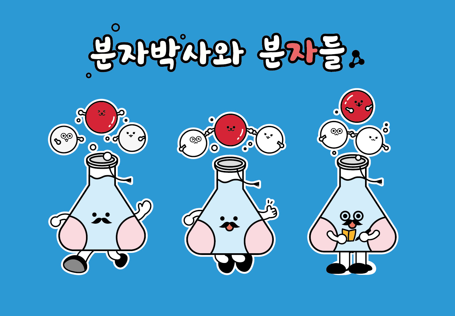 분자를 활용하여 과학을 연구하는 분자박사와 그의 분자들을 사랑스럽고 친근한 캐릭터로 표현하였습니다. 이러한 분자들이 모여서 다양한 화학 물질로 변할 수 있음을 나타내어 추후 애니메이션이나 교육자료로 활용할 수 있도록 제작하였습니다.