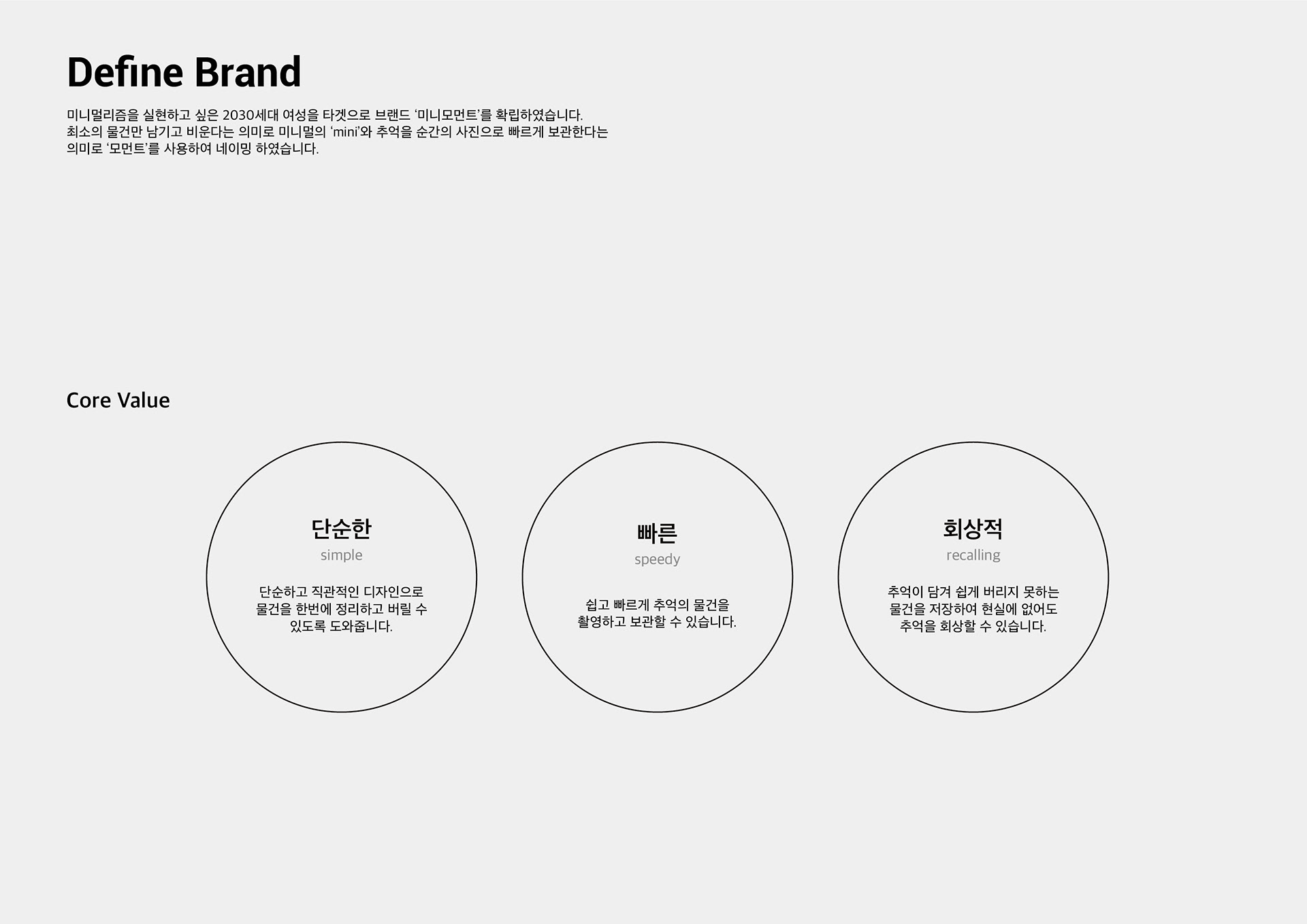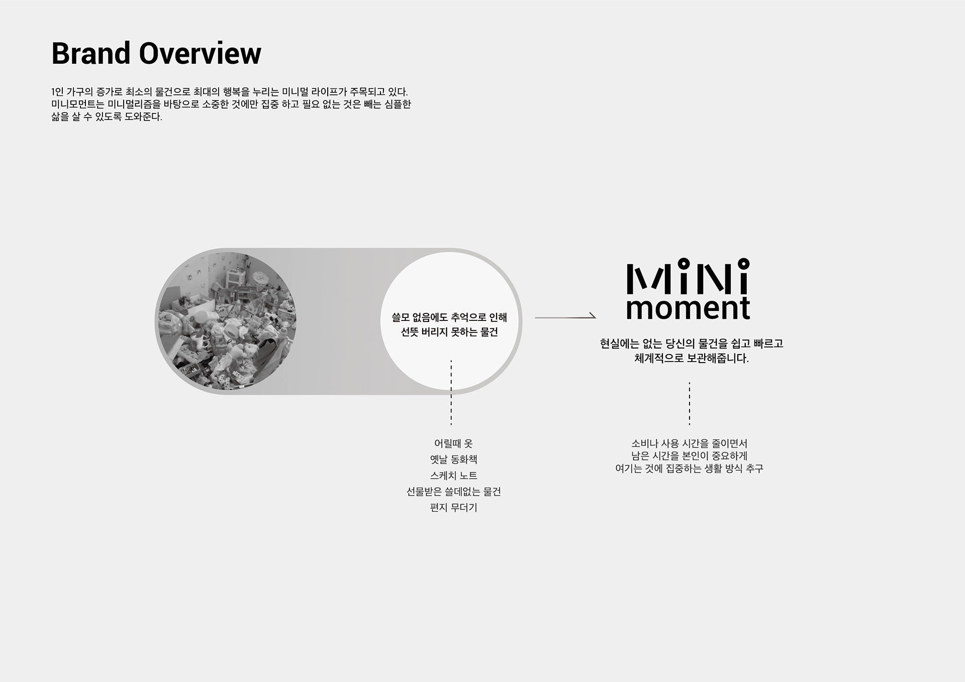 With the increase in the number of single-person households, minimal life that enjoys maximum happiness with minimal items is drawing attention. Minimal moments help you live a simple life based on minimalism, focusing on precious things and subtracting what you don't need. For those who can't throw away your things easily and quickly through an application for those who can't throw them away due to memories even though they're useless, they store your things that aren't in reality easily, quickly and systematically.